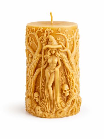A hand-poured beeswax candle featuring a woodland witch entwined in roots and ancient magic.