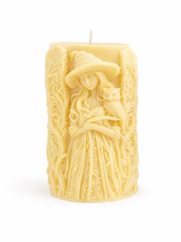 A glowing beeswax candle featuring a witch and her owl familiar—watchful, wise, and bound by silent devotion.